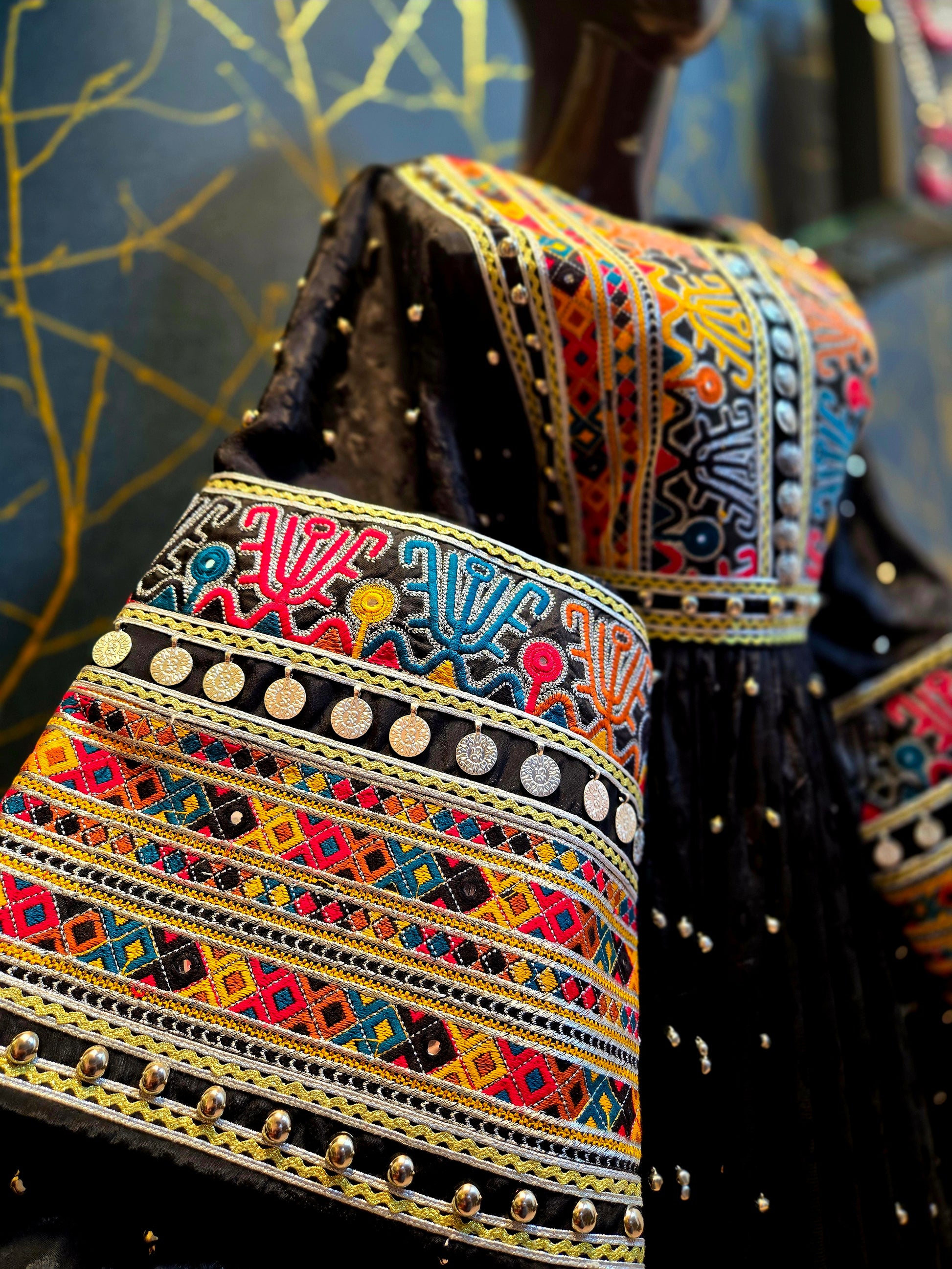 Bio: Step into a realm of artisanal mastery with this exquisite creation. The deep, lustrous black fabric serves as a dramatic backdrop for a symphony of vibrant, hand-embroidered patterns. Each stitch tells a story of rich cultural heritage, meticulously crafted to adorn and empower. This dress is more than attire; it's a wearable masterpiece, an heirloom in the making, designed for those who appreciate the artistry of tradition and the boldness of a statement piece.